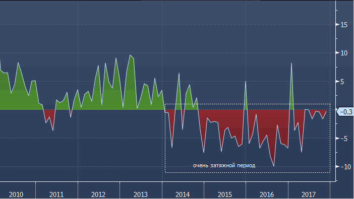 Реальный располагаемый доход (реальный доход после уплаты налогов с поправкой на инфляцию) в ноябре 2017 года по сравнению с ноябрем 2016 года сократился на 0.3%, что соответствовало прогнозным оценкам.