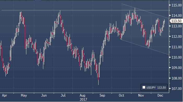 Конец текущего года может быть очень драматичным для трейдеров инструментами с фиксированной доходностью. Перед рождественскими праздниками ликвидность ухудшается, что, за счет исполнения стопов, может повысить волатильность и привести к еще более резкому росту доходностей. На рынке валют мы видим ответную реакцию на происходящее на рынке облигаций. Как известно, японские инвесторы очень живо реагируют на изменение доходностей в США. Мы видим, что японская иена в последние дни активно сдает позиции против доллара. Курс этой валютной пары сбалансирован для атаки ключевого уровня сопротивления (114.50 иен за доллар). Это при том, что доллар США не менее заметно сдает позиции по отношению к евро.