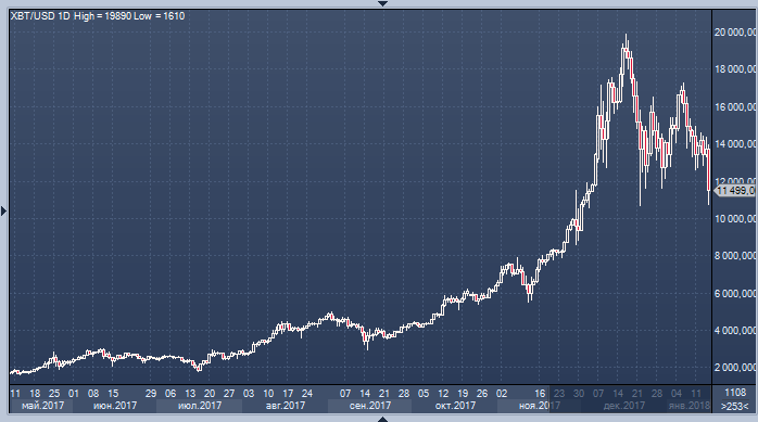 Масштабные коррекции биткоина после агрессивных ралли давно стали привычны для участников рынка криптовалют, и они в последнее время продолжали охотно выкупать его на спадах. Однако нынешний период консолидации оказался самым долгим с июня прошлого года, и спекуляции на тему возможности запрета на торговлю криптовалютами в Южной Кореи вслед за Китаем подорвали оптимизм быков - курс биткоина к настоящему времени сполз к свежим минимумам в районе $10779 (обозначив снижение более чем на 20%), лишь немного не дотянув до минимума 22 декабря около $10700.