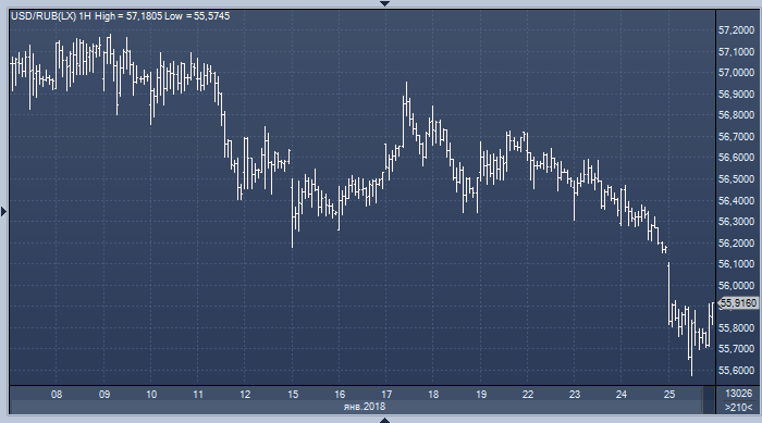 По итогам торгов в четверг 25 января курс доллара к рублю снизился на 26 копеек до 55.92, а курс евро к рублю - на 27 копеек до 69.33 (прим. ProFinance.ru: по состоянию на 23:50 МСК).