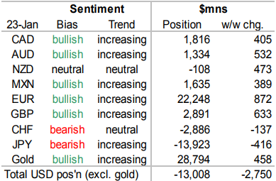 Как следует из последних данных CFTC, неделя до 23 января прошла под явным знаком спроса на «риск» - спекулянты продавали доллар против всех основных валют, за исключением традиционных «убежищ», таких как франк и иена. В результате этих событий объем чистого шорта по американской валюте вырос на $2.8 млрд до $13 млрд.