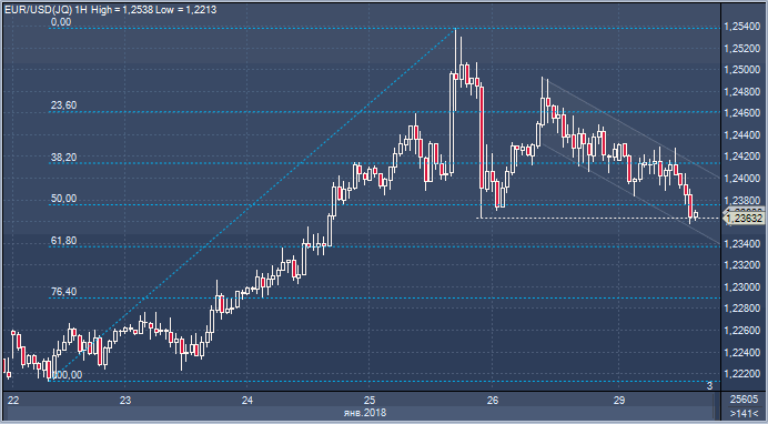 Курс доллара уверенно дорожает к евро на торгах в понедельник. Цены в паре EURUSD пытаются закрепиться ниже минимумов четверга. В настоящий момент доллар восстановил более 50% потерь предыдущей торговой недели (см. уровни Фибоначчи на графике).