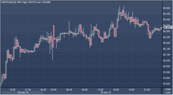 По итогам торгов в понедельник 29 января курс доллара к рублю вырос на 5 копеек до 56.33. Курс евро к рублю увеличился на 22 копейки до 69.75 (прим. ProFinance.ru: по состоянию на 23:50 мск).