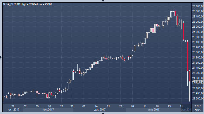 Небывалый обвал на американском фондовом рынке уже окрестили очередным «черным понедельником». Как и в прежние годы, усиление инфляции (резкий рост зарплат в пятничном отчет по рынку труда) в США выступило сигналом для пирующих быков фондового рынка о том, что пора заканчивать праздник. Только индекс широкого рынка S&P 500 пробил вверх 2800 пунктов и аналитики нарисовали ему следующую цель на 3000, как кто-то решил обратить внимание на обвал облигаций и воспользоваться подвернувшимся моментом, потянув за собой всех остальных. Феноменальный обвал акций сопровождался вчера не менее феноменальным взлетом цен на облигации: люди меняли одни бумаги на другие. Доходность 10-летних облигаций американского правительства всего за день рухнула в понедельник с 2.88% до 2.64%. Индекс широкого рынка S&P 500 (фьючерс, с учетом сегодняшнего обвала до 2529) терял 12% со своих абсолютных максимумов (2876.61). Вчера индекс потерял 4.1%. Это худший результат с августа 2011 года. Dow Jones Industrial Average упал в понедельник более чем на 1100 пунктов, что в абсолютном выражении стало самым сильным однодневным снижением в истории. Азиатские индексы переняли эстафету у индексов США: японский Nikkei 225 потерял почти 5%, и на других рынках региона также был зафиксирован значительный спад.