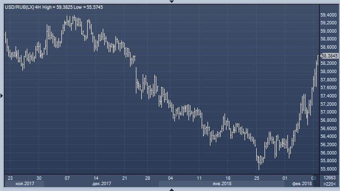 По итогам торгов в четверг 8 февраля курс доллара к рублю вырос на 80 копеек до 58.38, а курс евро к рублю - на 91 копейку до 71.48 (прим. ProFinance.ru: по состоянию на 23:50 МСК).