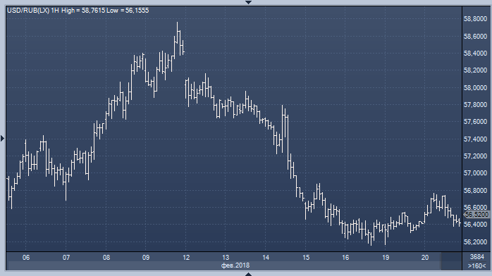 Цены на нефть несколько снизились в рамках консолидации после недавнего роста, однако российская валюта полностью проигнорировала данное событие. Динамика курса рубля к доллару и евро полностью определялась движениями евро/доллара. Напомним, что пик февральского налогового периода придется на следующие понедельник-среду (26-28 числа). Публикация данных по запасам нефти и нефтепродуктов в США сдвинулась со среды на четверг из-за праздновавшегося в понедельник Дня президентов.