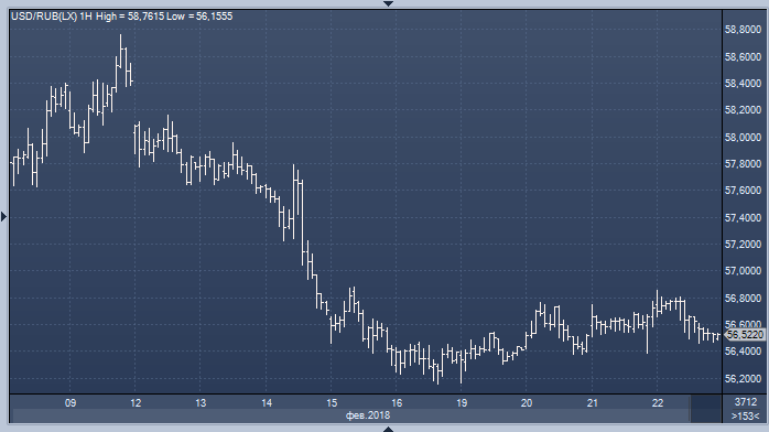 По итогам торгов в четверг 22 февраля курс доллара к рублю снизился на 20 копеек до 56.52, а курс евро к рублю - на 5 копеек до 69.61 (прим. ProFinance.ru: по состоянию на 23:50 МСК).