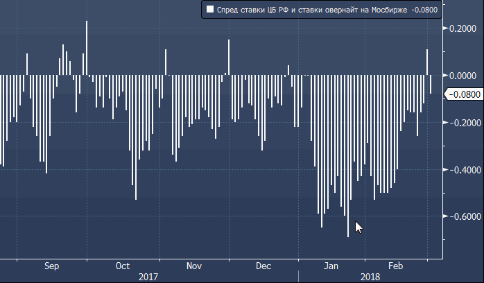 Впервые с декабря 2017 стоимость рефинансирования под залог облигаций на Мосбирже оказалась выше ключевой ставки Банка России, при этом спред между ставками достиг максимально значения с ноября. По мнению аналитиков Уралсиба, представители банковского сектора слишком увлеклись размещением средства на депозитах центробанка и покупкой купонных облигаций, выпускаемых им, и в ближайшее время ситуация нормализуется. Источник: ProFinance.Ru - Новости рынка Форекс
