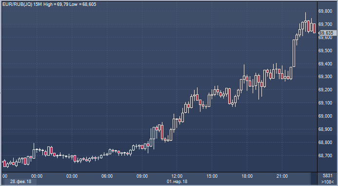 По итогам торгов в четверг 1 марта курс доллара к рублю вырос на 47 копеек до 56.80. Курс евро к рублю подпрыгнул на 89 копеек до 69.65 (прим. ProFinance.ru: по состоянию на 23:50 мск).