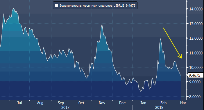 Трейдеры рынка опционов также не очень обеспокоены обострением отношений между Россией и Великобританией. Подразумеваемая волатильность одномесячных контрактов на пару доллар/рубль (USDRUB) мало изменилась, оставшись у минимума пяти недель даже после того, как премьер-министр Великобритании Тереза Мэй публично обвинила Россию в применении химического оружия на британской земле и предупредила об ответных мерах. Варианты сценариев, которые она может рассмотреть, включают требования дополнительных санкций в масштабах всего Европейского союза и отключение российских банков от системы межбанковских платежей Swift.