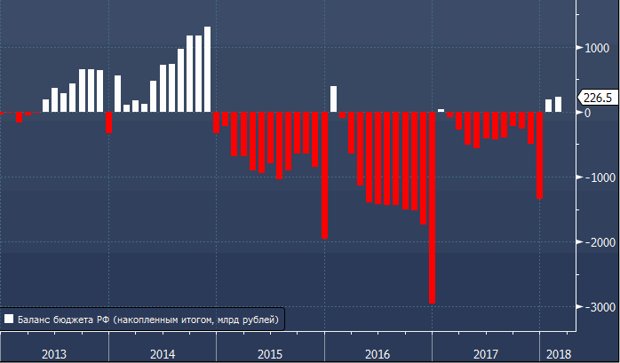 Согласно данным министерства финансов РФ, в первые два месяца 2018 года доходы федерального бюджета превысили расходы на 226.497 млрд рублей, что соответствует 1.7% от ВВП России, объем которого в этот период составил 13.582 трлн рублей.