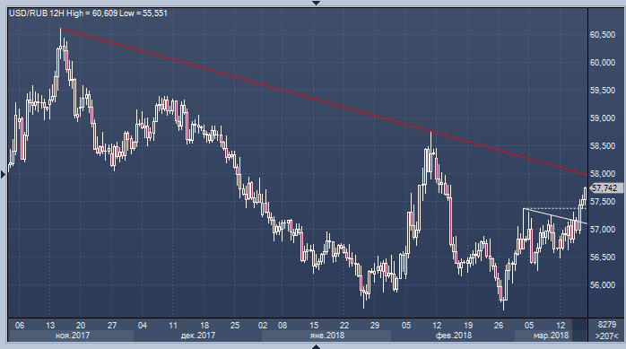 Российская валюта продолжает торговаться с медвежьим настроем на фоне углубления кризиса отношений России и Запада. Заместитель министра иностранных дел Сергей Рябков в интервью агентству Sputnik заявил, что Россия расширит черный список американских граждан и юридических лиц в дополнение к решению ответить британцам высылкой их дипломатов из России. Тем временем, пресс-секретарь президента России Дмитрий Песков назвал заявления главы МИД Великобритании Бориса Джонсона, обвинившего Владимира Путина в причастности к попытке убийства Сергея Скрипаля, «шокирующим и непростительным нарушением дипломатических правил приличия».