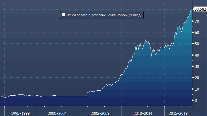 По данным Банка России, начиная с марта 2015 года, он ежемесячно увеличивал объем золота в своих резервах и в настоящий момент занимает шестое место в списке крупнейших владельцев этого драгметалла (после США, Германии, Италии, Франции и Китая).