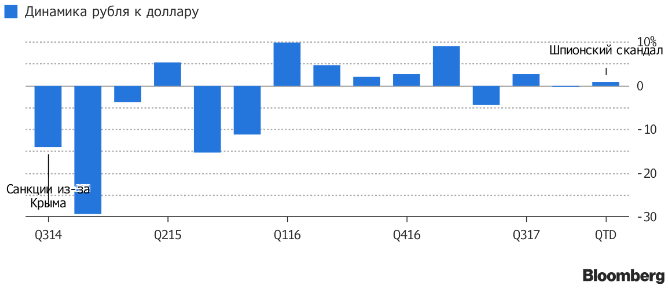 Рубль может завершить квартал в плюсе, несмотря на скандал с отравлением бывшего российского шпиона Сергея Скрипаля и его дочери Юлии, масштабную высылку дипломатов и обещание ответных мер РФ.