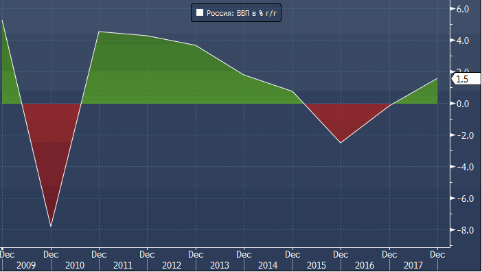 По словам главы Минэкономразвития Максима Орешкина, экономика страны начинает год на подъеме. В прошлом году экономический рост возобновился после двухлетней рецессии. По предварительной оценке Росстата, ВВП в 2017 году увеличился на 1.5%. В 2018-м экономика продолжит расти темпами около 2%, считает министр.