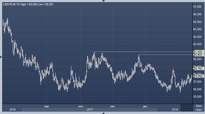 Курс доллара к рублю по итогам торгов в среду прибавил 34 копейки, чему также способствовало общее укрепление американской валюты, и завершил день на отметке 57.74, вновь протестировав линию сопротивления с 15 ноября около 57.80.