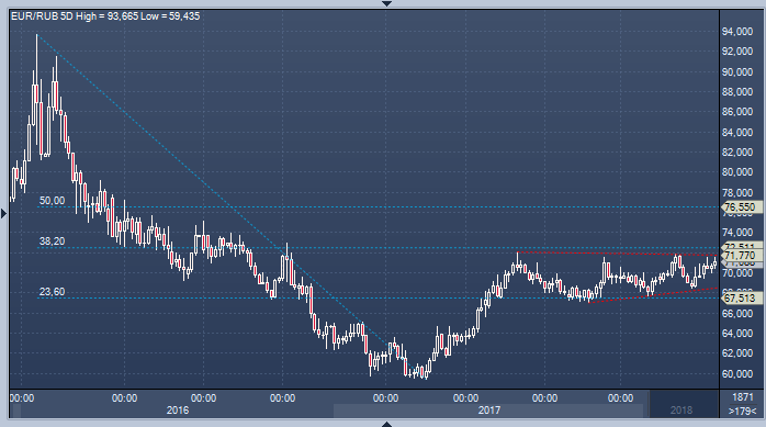 Курс евро к рублю, тем временем, в среду сдал 14 копеек до 71.05 рубля, но остается у верхней границы консолидационного диапазона последних месяцев, который выглядит конструктивным для быков. Прорыв выше 71.77/72.09 откроет EURRUB дорогу первоначально к 72.51 (38.2% от падения с 2016), а потенциально к 76.55 (50.0% того же движения). Дмитрий Храбров