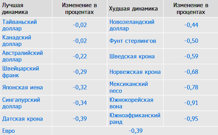Тайваньский доллар на первом месте по динамике к доллару США среди 15 основных валют. Он подешевел на 0.02% к концу торгов в Нью-Йорке. Худшую динамику демонстрирует южноафриканский рэнд, упав на 0.95%.