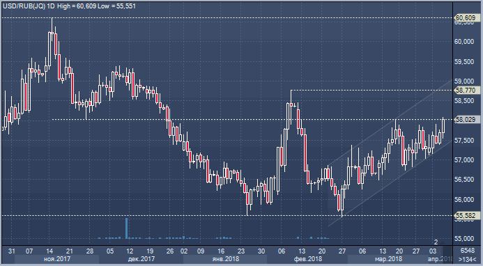 Курс доллара по отношению к рублю на торгах в пятницу 6 апреля поднялся выше 58.00.