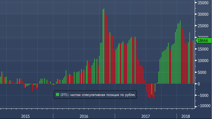 Как следует из последних данных американской Комиссии по торговле товарными фьючерсами (CFTC), за неделю до 3 апреля объем чистой длинной спекулятивной позиции во фьючерсах на рубль вырос впервые за три недели (+490 контрактов до 18 666 контрактов). Таким образом, спекулянты находятся в чистом лонге по российской валюте уже 30 недель подряд, а до этого занимали чистую короткую позицию 10 недель подряд. С начала года курс доллара к рублю вырос на 1.5%.