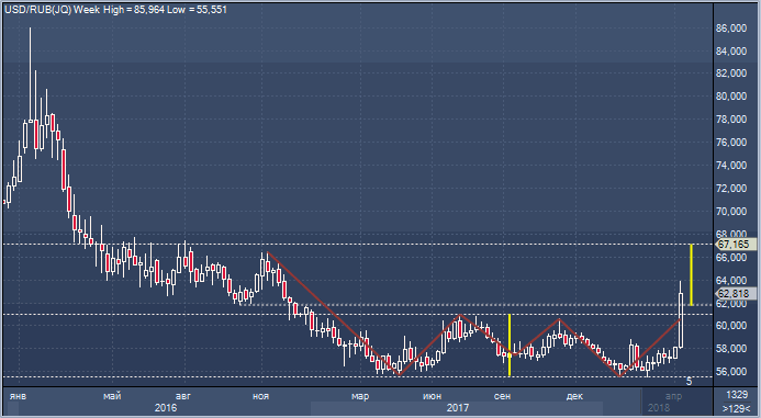 Если за ответом на этот вопрос обратиться к техническому анализу, придется рассмотреть графики недельного таймфрейма. Здесь по факту пробития июльских максимумом 2017 года и минимумов октября 2016 года сформирована такая фигура графического анализа как «двойное дно». Ее реализация подразумевает, что курс доллара вырастет до 67 рублей. В этом случае курс USDRUB вернется в область значений, которые последний раз наблюдались в период с мая по август 2016 года.