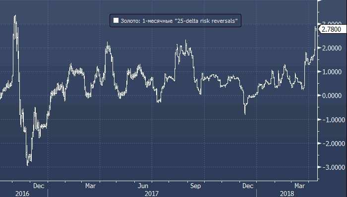 В результате вчерашнего краткосрочного взлета цен на золото выше сопротивления $1360 так называемые одномесячные «risk reversals» (дифференциал премии Call и Put с дельтой 25%) вырос с 0.2225% по состоянию на 21 марта почти до 2.90%, что является рекордным значением с 11 июля 2016 года. Резкий рост подразумеваемой волатильности кол-опционов отражает большой спрос на защиту от дальнейшего роста драгметалла со стороны медведей и увеличение ставок со стороны быков.