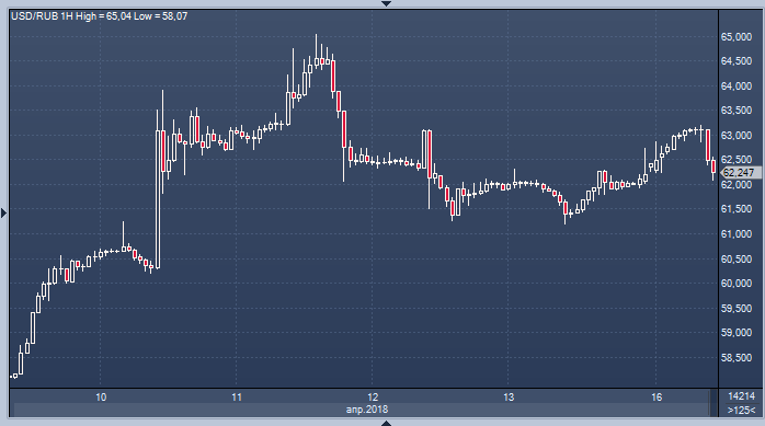 Динамику рубля вновь задает геополитика. На какое-то время рубль может быть безучастным к тому, что происходит на рынках нефти, акций, облигаций, ЕМ. Сегодняшняя реакция после открытия торгов на Московской бирже — своего рода симбиоз реакции на три геополитических события, которые случились на выходных: ракетный удар США и Великобритании на Сирию, факт невмешательства России в военный конфликт с США и угроза новых санкций. Первый и третий фактор негативны. На них рубль отреагировал снижением при открытии торгов. По итогам первых минут торгов курс доллара вырос на 51 копейку до 62.56 рубля, а курс евро вырос на 58 копеек до 77.14 рубля. Представитель ЦБ Юдаева предупредила рынки, что в случае необходимости регулятор вмешается в ход валютных торгов. Рынок акций РФ слегка снижается в начале дня, акции «Русала» теряют 5.7%, торгуясь по 19.8 рубля. В начале дня они падали на 23.3%, до 16.11 рубля, что близко к историческому минимуму около отметки 15.04 рубля, достигнутому 9 апреля.