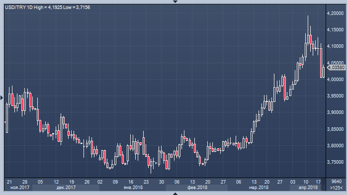 25 апреля состоится заседание центрального банка. И спекуляции на тему, что регулятор поддержит (повысит ставки) активы страны, которые страдают под тяжестью одного из самых широких дефицитов текущего счета среди ЕМ и двузначной инфляции, усиливаются. Лира, которая упала до рекордных минимумов против доллара и евро в начале этого месяца, корректируется, как и турецкие облигации. Комментарии президента Турции Реджепа Тайипа Эрдогана в среду о выборах в июне немного успокоили разнервничавшихся инвесторов.