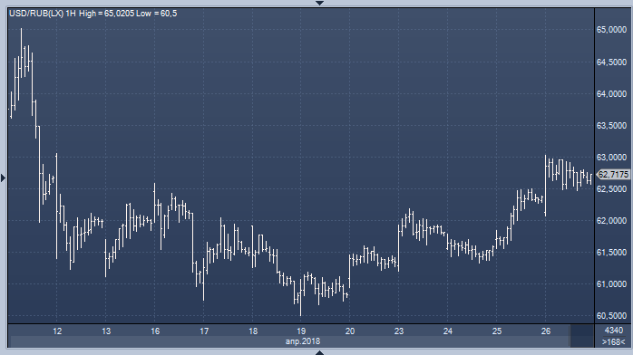 По итогам торгов в четверг 26 апреля курс доллара к рублю вырос на 34 копейки до 62.72, а курс евро к рублю - на 5 копеек до 75.85 (прим. ProFinance.ru: по состоянию на 23:50 МСК).