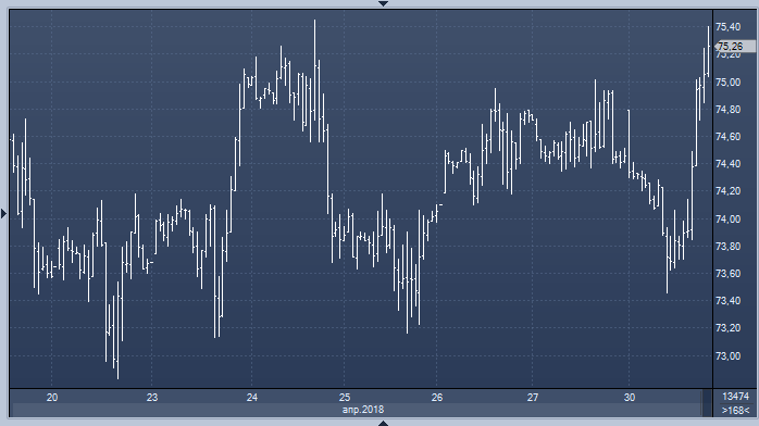 Утром понедельника цены на нефть несколько снизились, однако в середине европейской сессии на рынок пришли покупатели. Черное золото пользовалось хорошим спросом весь вечер, а на новостях о том, что Израиль обвинил Иран в проведении секретной программы по созданию ядерного оружия, котировки Brent взлетели в область максимумов 24 апреля около $75.40.