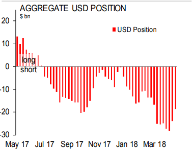 Как следует из последних данных CFTC, за неделю до 1 мая объем чистой короткой спекулятивной позиции по доллару сократился сразу на $5.3 млрд и достиг семинедельного минимума в $18.6 млрд.