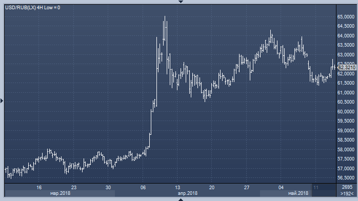 По итогам торгов во вторник 15 мая курс доллара к рублю вырос на 49 копеек до 62.32, а курс евро к рублю - на 1 копейку до 73.74 (прим. ProFinance.ru: по состоянию на 23:50 МСК).