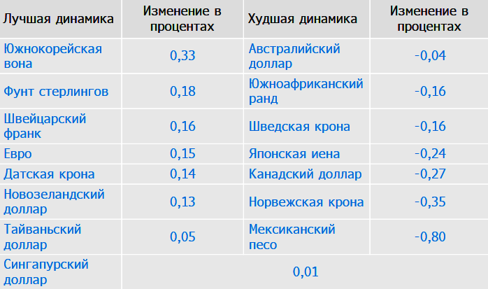 Южнокорейская вона лидирует по темпам роста к доллару США среди 15 основных валют на первом месте по динамике к доллару США среди 15 основных валют, укрепившись на 0.92% к концу торгов в Нью-Йорке. Худшую динамику демонстрирует мексиканский песо (вчерашний лидер), упав на 0.80%, свидетельствуют данные в торговом терминале Bloomberg. Евро подорожал за прошедший торговый день на 0.15%