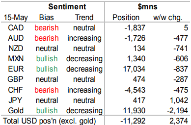 Как следует из последних данных CFTC, на неделе до 15 мая спекулянты вновь (четвертый раз подряд) покупали доллар против всех основных валют, за исключением луни и иены. Теперь объем чистой короткой позиции по нему составляет меньше половины от значений середины апреля ($28 млрд).