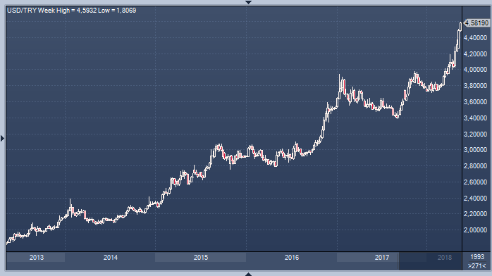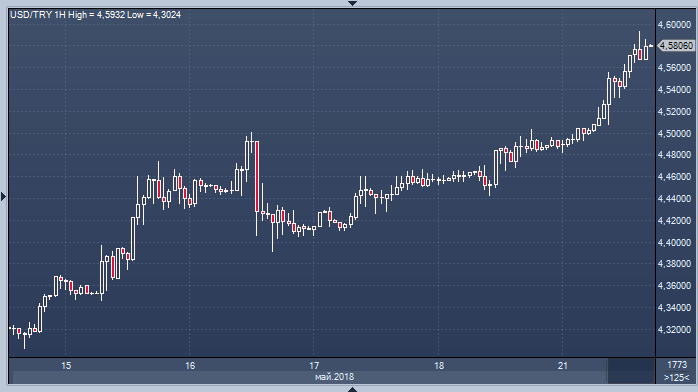 Лира падает без остановок против доллара с 1 января. Его реплика прозвучала в тот момент, когда Турция конкурирует с Аргентиной, Анголой и Венесуэлой за самую худшую в мире валюту в этом году. Турецкая лира снизилась более чем на 17% по отношению к доллару в 2018 году, что является наихудшим результатом в мире, не считая трех перечисленных стран. По словам Алнуса, такие потери будут продолжаться, если не произойдет вмешательства. Основываясь на темпах ослабления лиры в последние недели, курс валюты может упасть до 4.58 за доллар к концу этой недели и 4.75 за доллар на следующей неделе, сказал брокер. Лира упала на 2.3%, достигнув рекордного минимума 4.5946 за доллар к 16:00 в Стамбуле в понедельник.