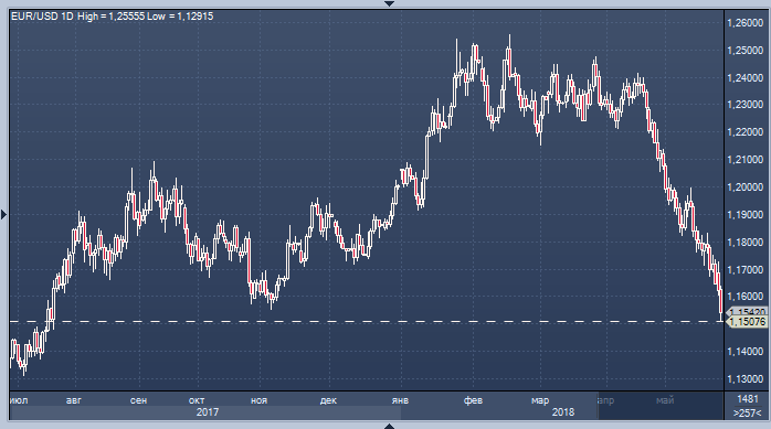 Евро немного скорректировался вверх днем в среду, после того как утром снижался до 10-месячного минимума. Сейчас рынок перешел к консолидации. Одновременно с евро падали облигации Италии и Испании на фоне политической нестабильности в этих странах. Стоимость итальянских госбондов во вторник снизилась максимально более чем за 25 лет. Президент Италии Серджо Маттарелла вчера заблокировал попытку популистов сформировать правительство, нанеся удар по воле итальянского избирателя, который уполномочил представлять свои интересы партии «5 звезд» и «Лига Севера». Маттарелла назначил бывшего экономиста Международного валютного фонда Карло Коттарелли временно исполняющим обязанности премьер-министра, поручив ему планирование досрочных выборов и принятие нового бюджета. Экономист Карло Коттарелли, получивший вместо Джузеппе Конте мандат на формирование правительства Италии, заявил, что при отсутствии доверия его кабмину в парламенте внеочередные выборы пройдут в стране после августа.