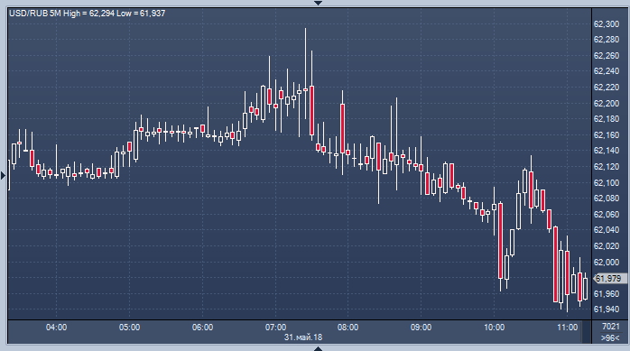 Российская валюта, которая вчера прибавил целый рубль к доллару, сегодня решила осмотреться, хотя факторы, вызвавшие вчера движение котировок, продолжают сохраняться и сегодня. Речь прежде всего идет об отскоке евро, акций и цен на нефть на мировом рынке. Евро продолжил расти в четверг утром и даже вышел на новый локальный максимум к доллару, поскольку страхи инвесторов несколько улеглись на фоне попыток руководства Италии разрешить политический кризис и избежать чреватых новыми потрясениями досрочных выборов. Временно исполняющий обязанности премьер-министра Италии Карло Коттарелли рассказал вчера о появлении шансов «на рождение нового политического руководства», добавив, что нестабильность на финансовом рынке заставила его «ждать дальнейшего развития ситуации». Его слова успокоили разнервничавшихся инвесторов, которые всерьез стали опасаться усиления позиций популистов по итогам новых выборов и развала еврозоны.
