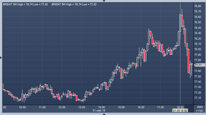 Цены на нефть Brent активно росли после публикации данных, указавших на существенное падение запасов топлива в США, однако сейчас от их роста не осталось и следа, что можно видеть на приведенном ниже графике. Так, котировки июльских фьючерсов на Brent, торги которыми истекают в четверг, на лондонской бирже ICE Futures поднимались до $78.77 за баррель, а сейчас находятся уже более чем на доллар ниже.