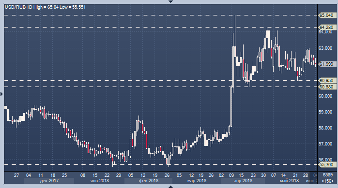 Старший аналитик Commerzbank Аксель Рудольф считает, что пара доллар/рубль остается нацелена на рост в область 64.28/65.04. Он отмечает, что USD/RUB сформировал дно в районе минимума 55.42, достигнутого в феврале, что недалеко от минимума апреля 2017 года на уровне 55.70 и минимума января на уровне 55.58, а затем вырос к апрельскому максимуму на уровне 65.04. После этого последовала консолидация, которая переросла в падение до недавних минимумов на уровне 60.95/58. Далее пара снова вернулась к росту.