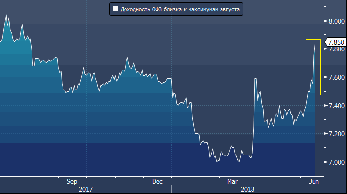 Доходность ОФЗ 26212 выросла на 12 базисных пунктов до 7.87% годовых после скачка на 20 базисных пунктов в пятницу, который стал максимальным с начала апреля.