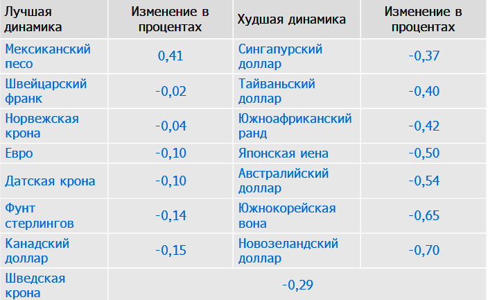 Мексиканский песо на первом месте по динамике к доллару США среди 15 основных валют, укрепившись на 0.41% к концу торгов в Нью-Йорке. Худшую динамику демонстрирует новозеландский доллар, упав на 0.70%, свидетельствуют данные в торговом терминале Bloomberg. Евро подешевел за прошедший торговый день на 0.10%.