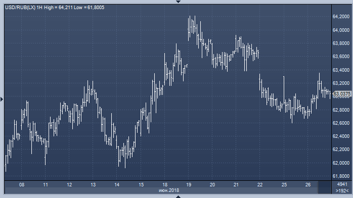 По итогам торгов во вторник 26 июня курс доллара к рублю вырос на 29 копеек до 63.04, а курс евро к рублю снизился на 8 копеек до 73.37 (прим. ProFinance.ru: по состоянию на 23:50 МСК).