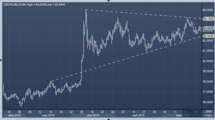 По итогам торгов в среду 27 июня курс доллара к рублю вырос на 18 копеек до 63.22, а курс евро к рублю снизился на 36 копеек до 73.01 (прим. ProFinance.ru: по состоянию на 23:50 МСК).