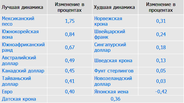Мексиканский песо на первом месте по динамике к доллару США среди 15 основных валют, укрепившись на 1.75% к концу торгов в Нью-Йорке. Худшую динамику демонстрирует японская иена, упав на 0.42%, свидетельствуют данные в торговом терминале Bloomberg. Евро подорожал за прошедший торговый день на 0.40%.