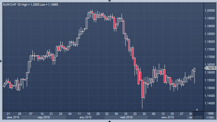 Франк коснулся 1.13368 за евро 29 мая, самого сильного уровня за почти девять месяцев, так как политические опасения в Италии омрачили рисковые настроения. Средняя оценка аналитиков по валюте упала до 1.18 к концу года.