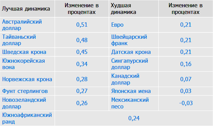 Австралийский доллар на первом месте по динамике к доллару США среди 15 основных валют, укрепившись на 0.51% к концу торгов в Нью-Йорке. Худшую динамику демонстрирует мексиканский песо, упав на 0.03%, свидетельствуют данные в торговом терминале Bloomberg. Евро подорожал за прошедший торговый день на 0.21%.