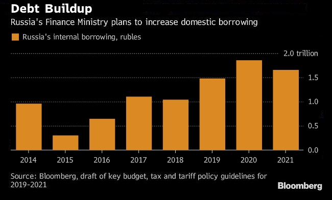В соответствии с документом, в котором изложены основные направления и принципы налоговой и бюджетной политики, целевой показатель Министерства финансов повысится на четверть в 2020 году, а в следующем году снизится. Россия будет иметь первичный дефицит бюджета, который исключает расходы на обслуживание долга, в течение всего периода. Не меняя концепцию своего подхода после санкции, введенных в апреле, Россия стремится сохранить неприкосновенным Фонд национального благосостояния и полагаться в основном на внутренние заимствования для финансирования своих планов расходов на инфраструктуру. По мере роста напряженности в мировой торговле и попыток развивающихся экономик приспособиться к ожиданиям повышения процентных ставок в США России также предстоит справиться с новой реальностью после того, как иностранные инвесторы распродавали облигации, номинированные в национальной валюте, после раунда американских санкций, показывая, насколько уязвим внутренний рынок долга.