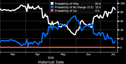 В последние пару дней вероятность такого шага в августе, действительно, уменьшилась, но все еще остается высокой — исходя из модели, основанной на кривой OIS (процентные свопы овернайт), она составляет 84.6%. Аналитики ING предупреждают, что обострение политического кризиса в Великобритании может заставить Банк Англии повременить с повышение, что будет крайне негативно для фунта. В банке предупреждают, что с учетом текущих ожиданий реакция британской валюты на такое решение обещает быть куда более яркой, нежели на повышение ставки.