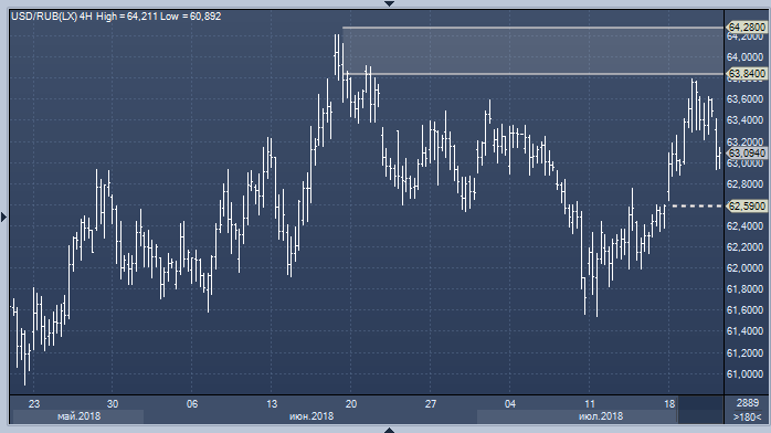 «На прошлой неделе пара протестировала область максимумов мая-июня и раннего июля 63.84-64.28, после чего откатилась вниз», - пишет Аксель Рудольф, старший аналитик банка. - «До тех пор, пока доллар/рубль находится ниже этой области, вероятно, будет преобладать диапазонная торговля с возможным скорым тестом 55-дневной МА (62.59). Более важная поддержка — 60.58/51 (максимум ноября и минимум середины апреля). До тех пока, пока эта область не пробита, мы будем оставаться долгосрочными быками по паре. После закрытия сессии выше 64.21/28 следующей технической целью станет отметка 65.04».
