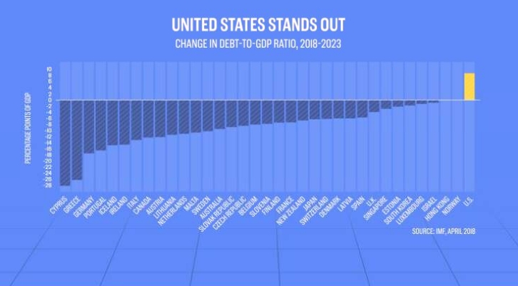 Но МВФ предупредил, что сейчас настало время для инвесторов и политиков обратить внимание на растущий долг, выделив Соединенные Штаты. Фонд сказал, что пересмотренный налоговый кодекс и соглашения о расходах означают, что США являются единственной развитой экономикой, в которой отношение долга к ВВП будет увеличиваться в течение следующих пяти лет.